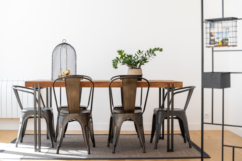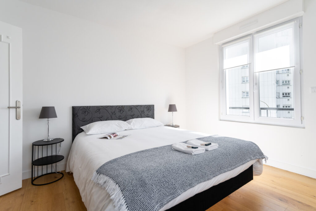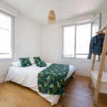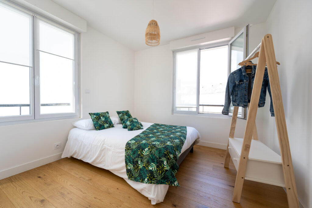 - Chambre : table de chevet, lampe de chevet, rangement, bureau et chaise
