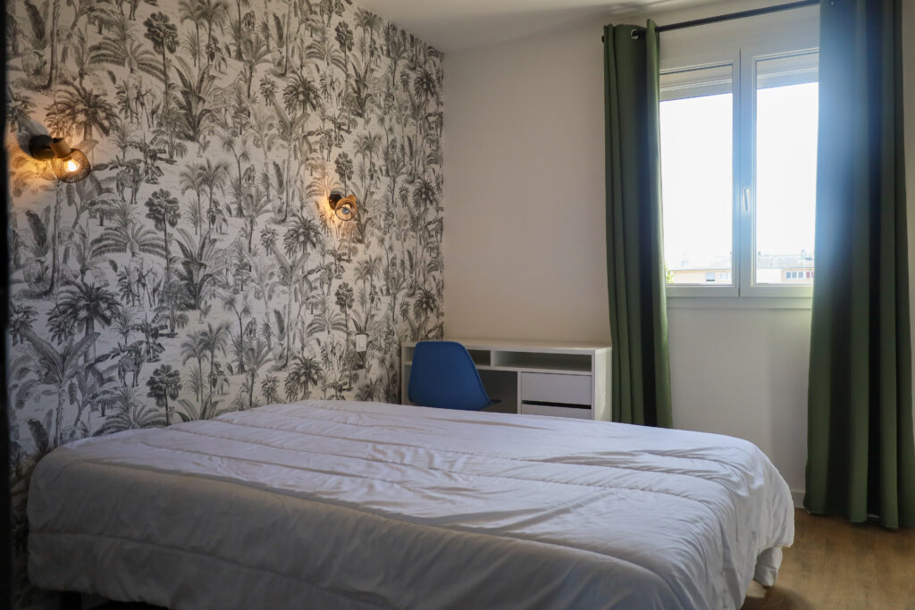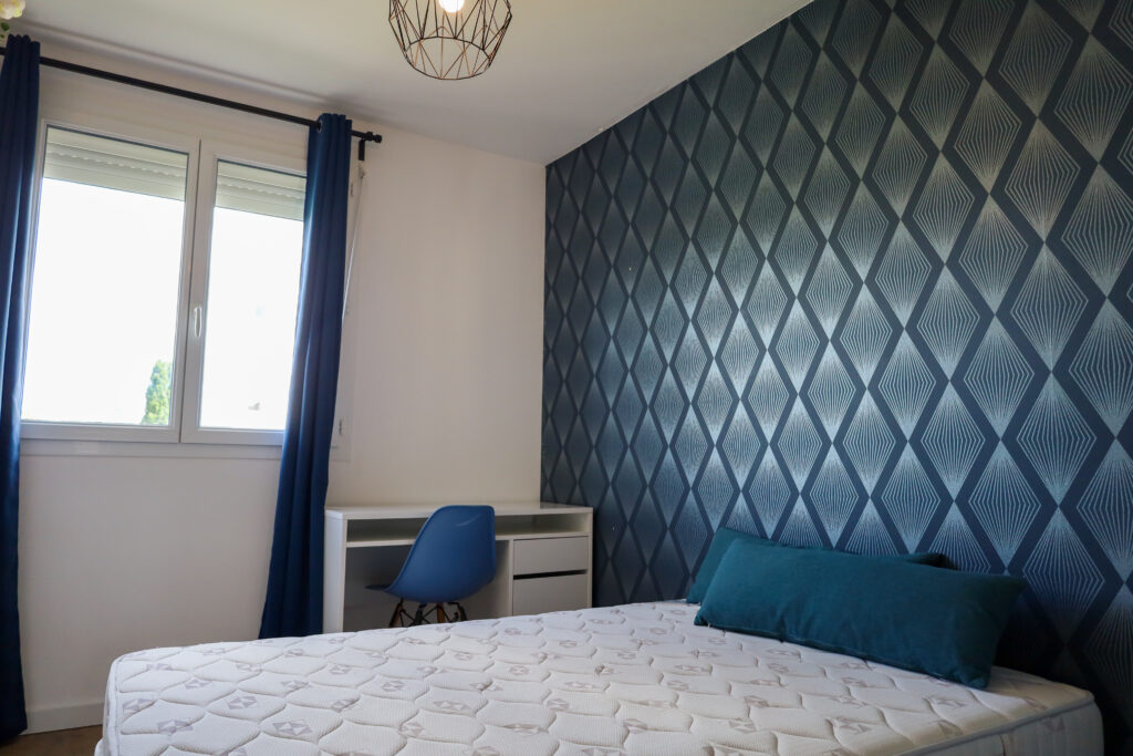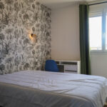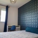 - Chambre : table de chevet, lampe de chevet, rangement, bureau et chaise