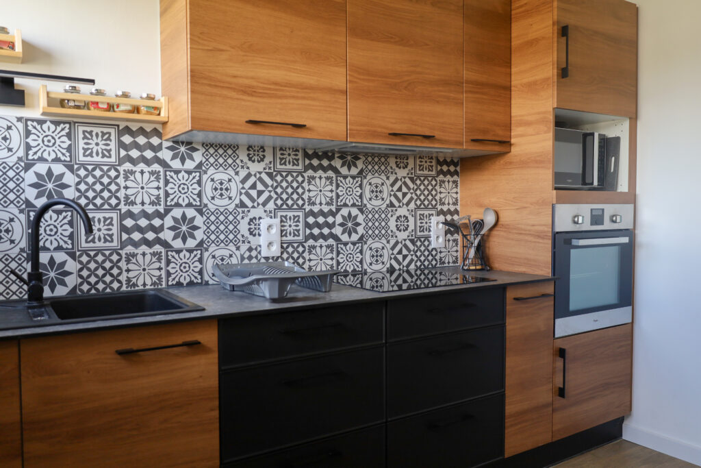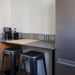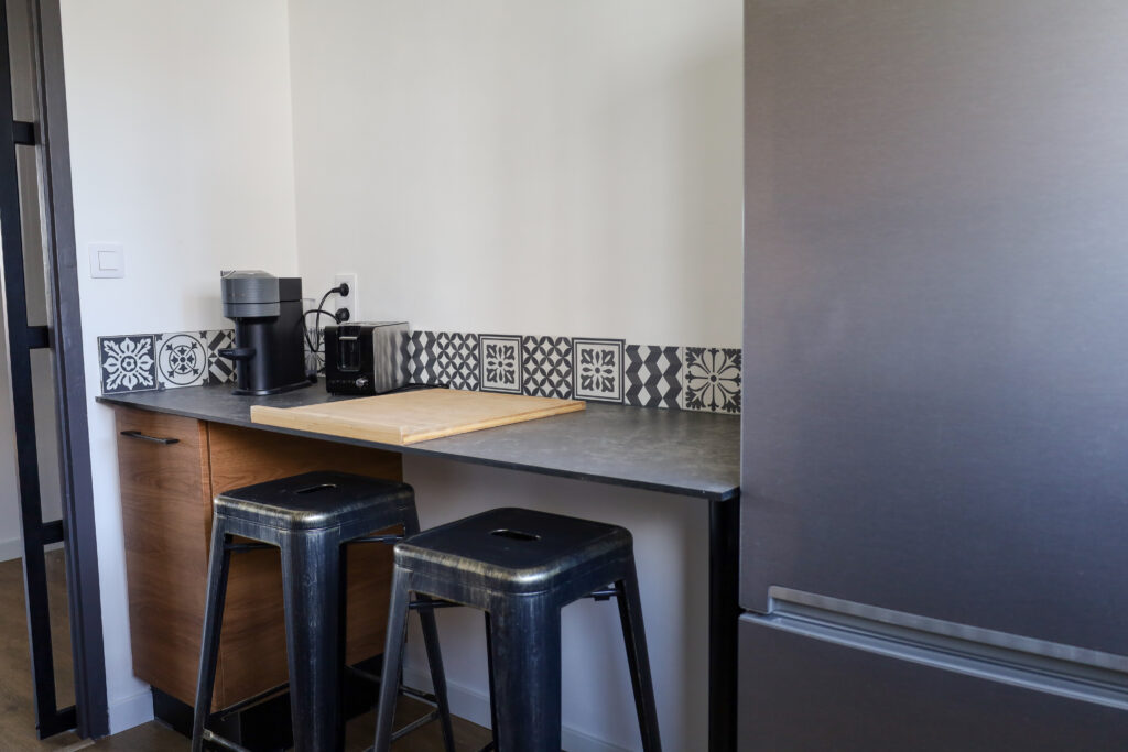 - Cuisine équipée aménagée : 1 frigos avec congélateur, four, micro-ondes, machine à café, bouilloire, plaque de cuisson électrique (4 feux), vaisselle