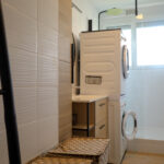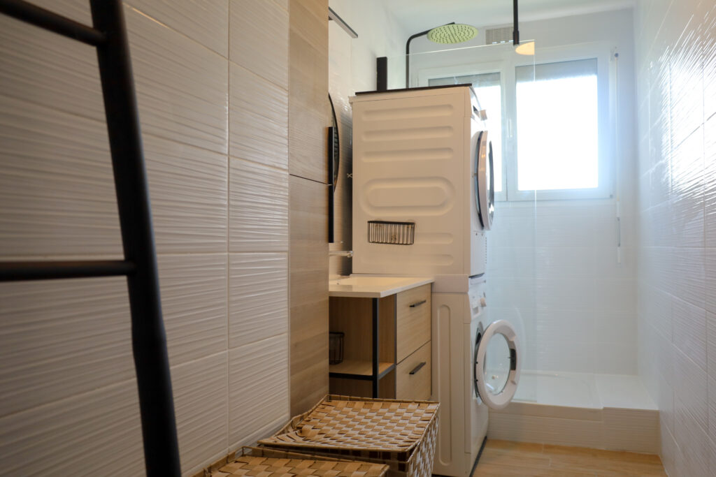 - Salle de bain : Une vasque, machine à laver, sèche linge, sèche cheveux, placard et rangement pour chacun, panier à linge sale pour chacun
