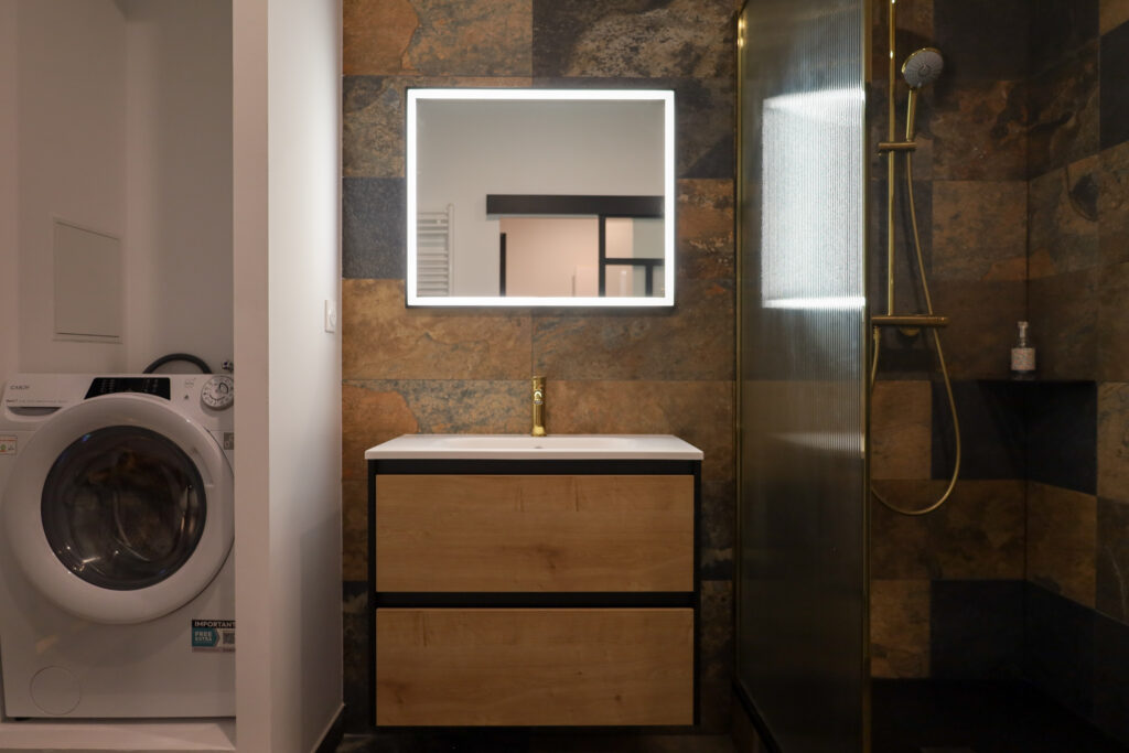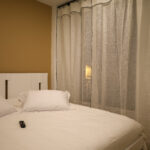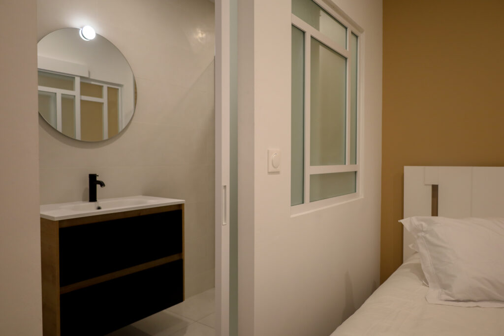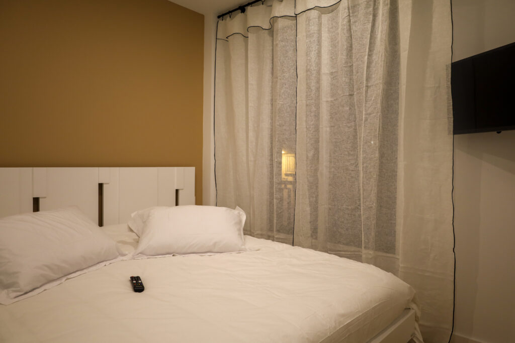 - Une chambre avec lit Queen Size (160x200cm), placard avec penderie, télévision HD et salle d’eau privative avec sèche-serviettes, douche à l’italienne et miroir.